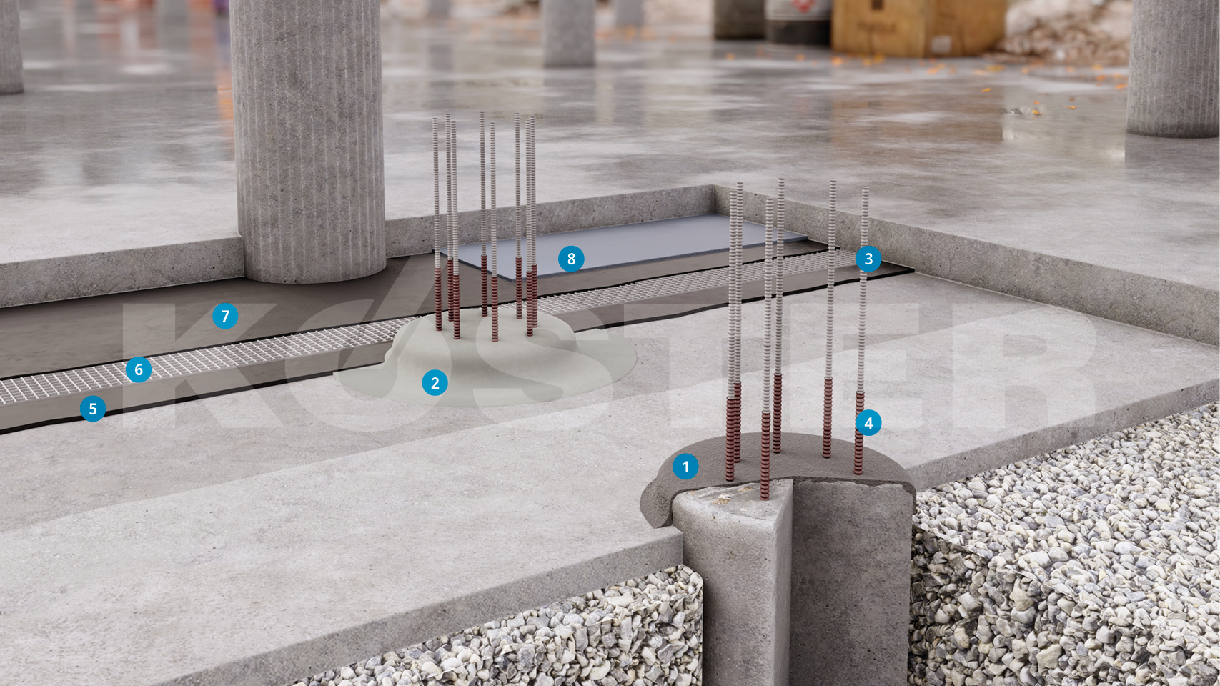 Najpre se s glave pilota uklanjaju svi ostaci koji bi mogli smanjiti prionjivost. Nakon toga se šip reprofilira s KÖSTER Reparaturni Mort Plus prilikom čega je potrebno izvesti holker prema stranama. Hidroizolacija šipova se izvodi s KÖSTER NB 1 Sivi.