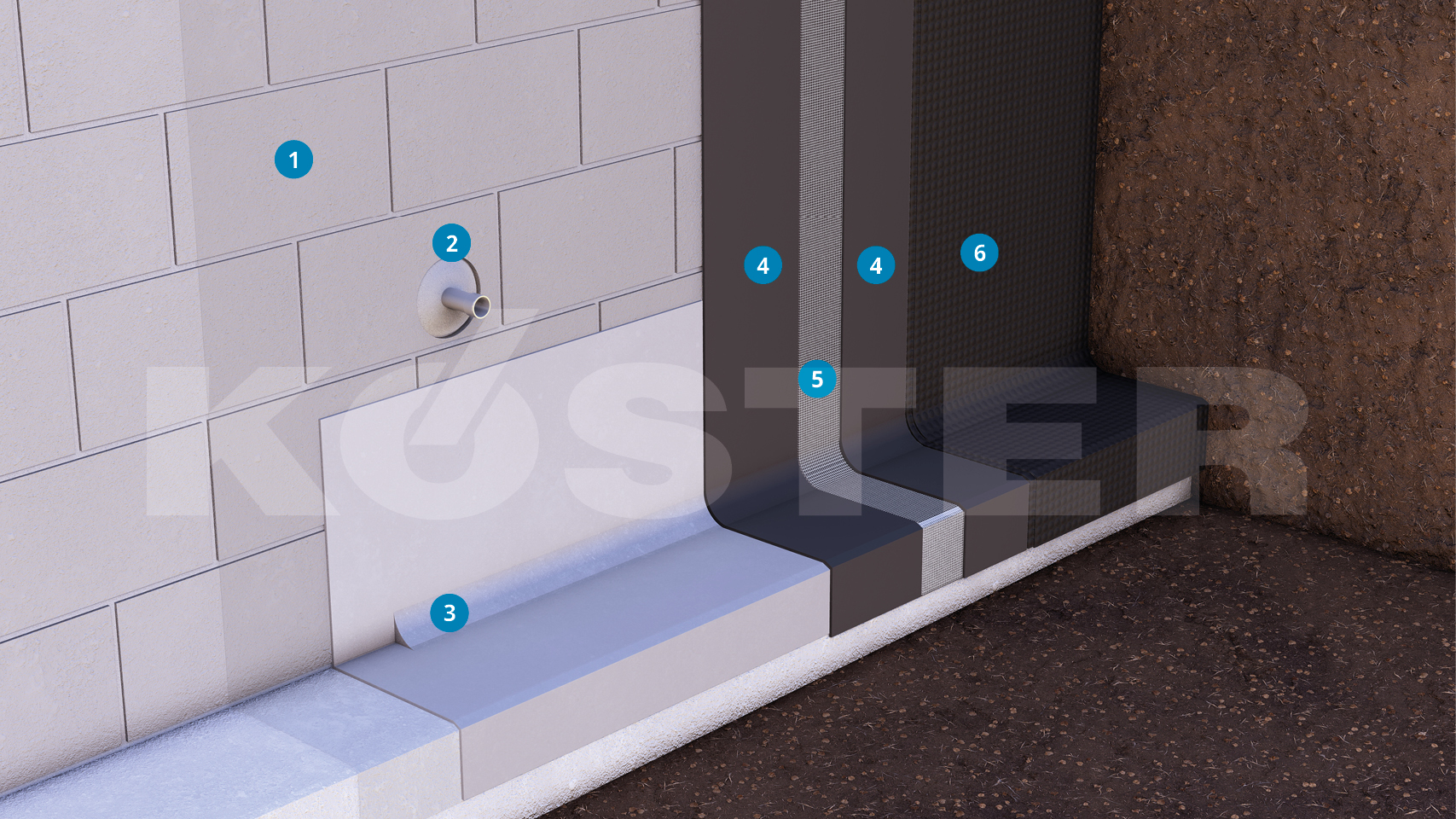 Zaštita od podilaženja vode na donjim završecima postiže se premazivanjem površine sa KOSTER NB1 Grey pomešan sa NB1 Flex.Kako bi se izbeglo naprezanje bitumenske hidroizolacije instaliraju se holkeri sa KOSTER Repair Mortar.