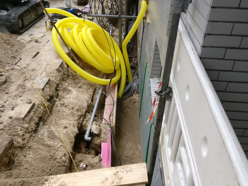 Nach Straßenbauarbeiten, die nicht direkt am Haus stattgefunden haben, durchfeuchten die Kellerwände massiv. Im Gehweg verlaufen alle Versorgungsleitungen. Die Eigentümergemeinschaft hat sich trotz der höheren Kosten gegenüber einer Vergelung für die Kelleraußenabdichtung mit KÖSTER Deuxan 2K entschieden. Die Wand wurde freigelegt, gereinigt, mit Bitumenvoranstrich und zwei Lagen KÖSTER Deuxan 2K inkl. Vlies abgedichtet. Eine Schutz- und Drainagebahn wurde mit Abschlussschiene montiert. Die Drainage wurde auf Sohlenhöhe mit Gefälle verlegt. Lediglich der Revisionsschacht mit Sandfang ist im Durchmesser (jetzt 300 mm) reduziert eingebaut worden. Alte Spundwände und Versorgungsleitungen haben kein anderes Maß zugelassen.