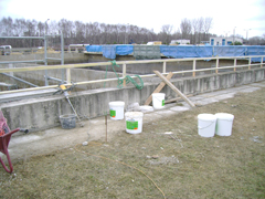 Restoration of concrete elements in the sewage treatment plant. Joints and pipe penetrations were waterproofed with KÖSTER Joint Sealant FS V/H. The concrete was repaired using KÖSTER Betomor® Multi A. The protection of the surface was carried out with KÖSTER EM-VS.
